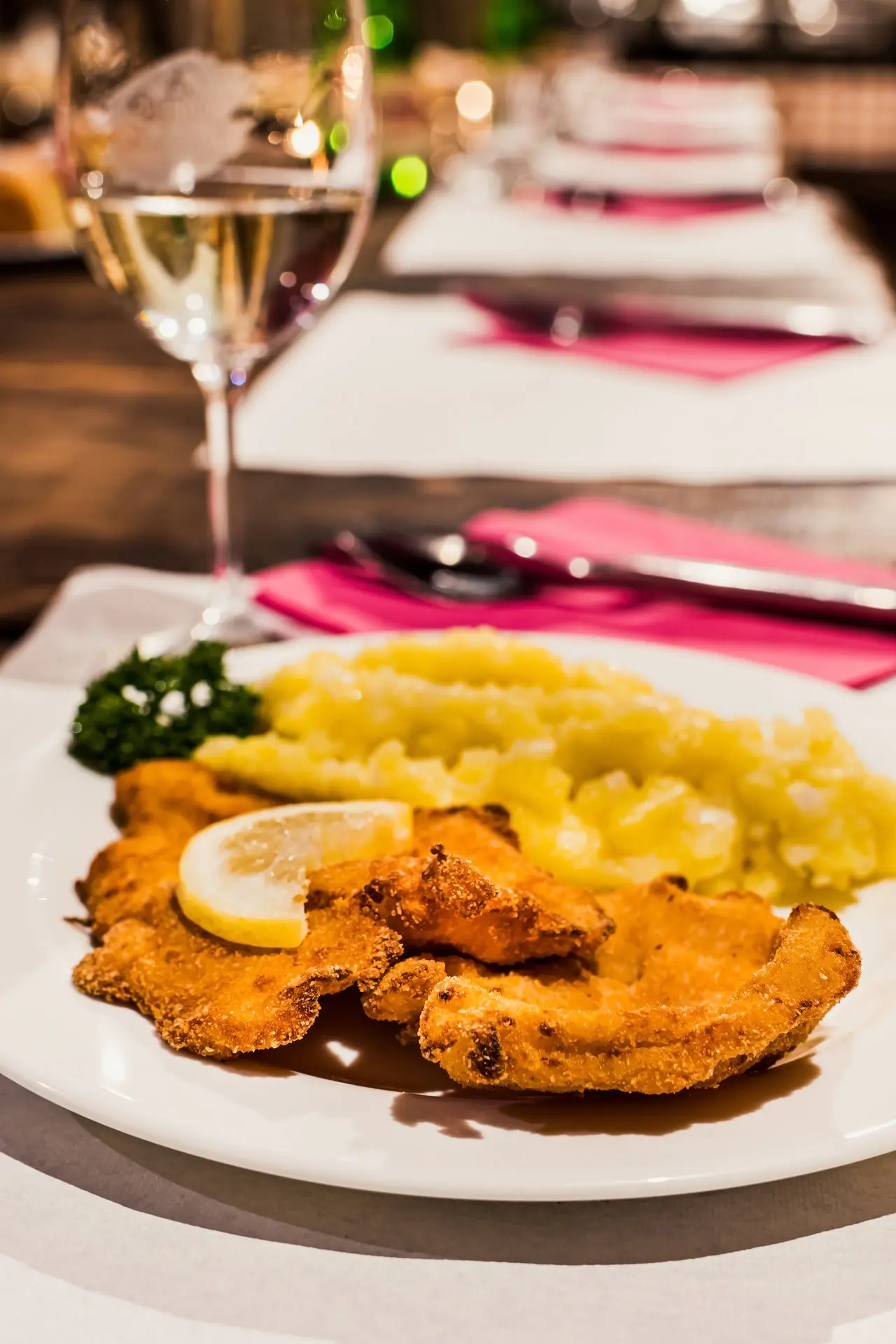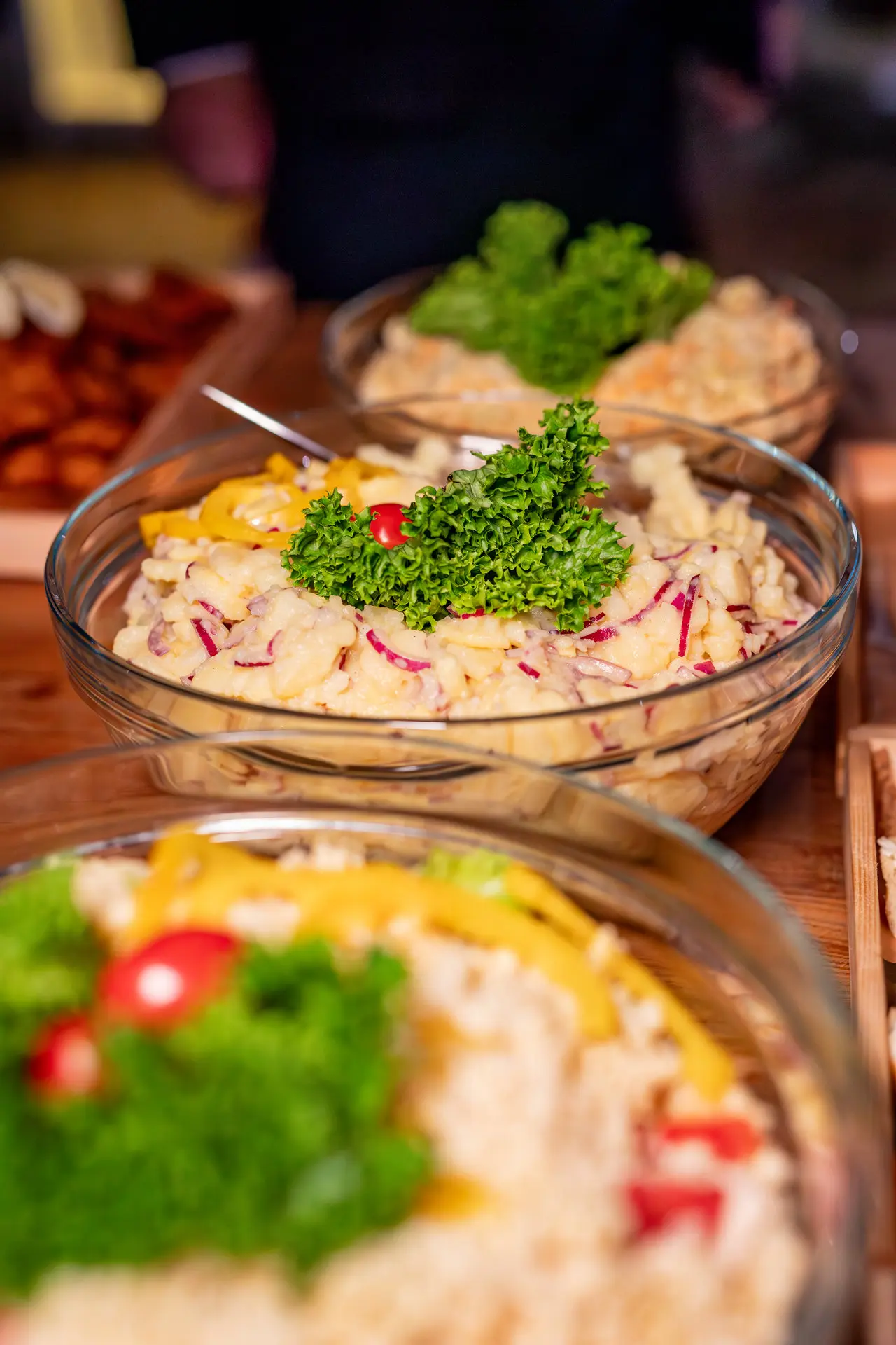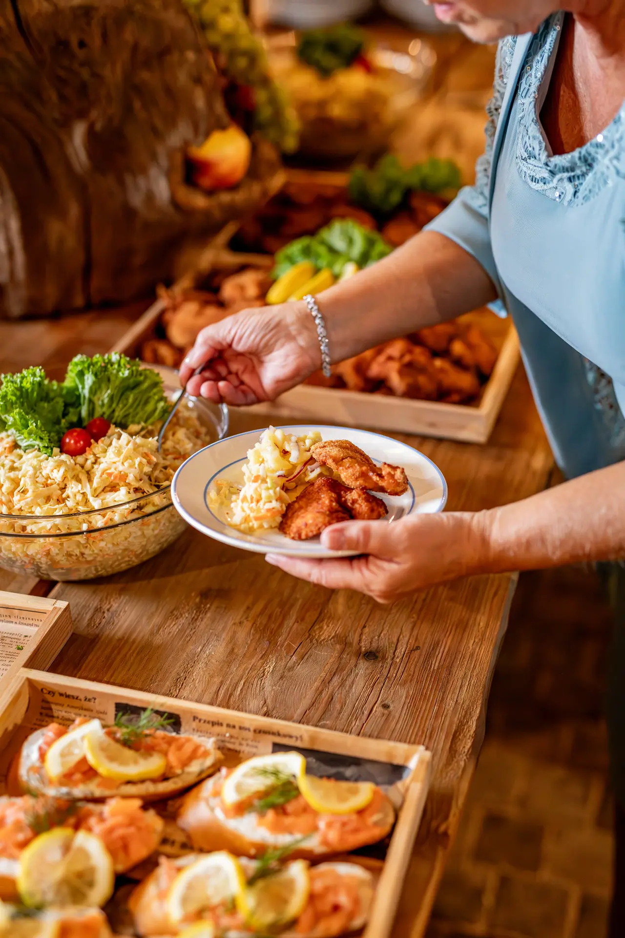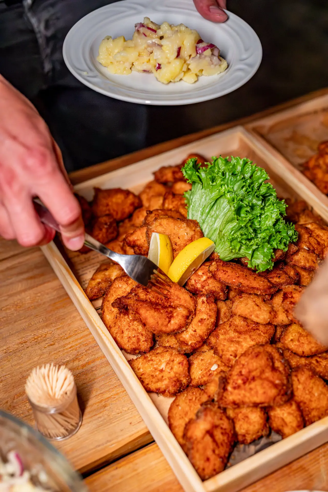 - Tři teplá jídla ve vyhřívaných chafingových nádobách, kuřecí řízek, pečená kachna, vepřová pečeně, dušené zelí, bramborový salát, chléb